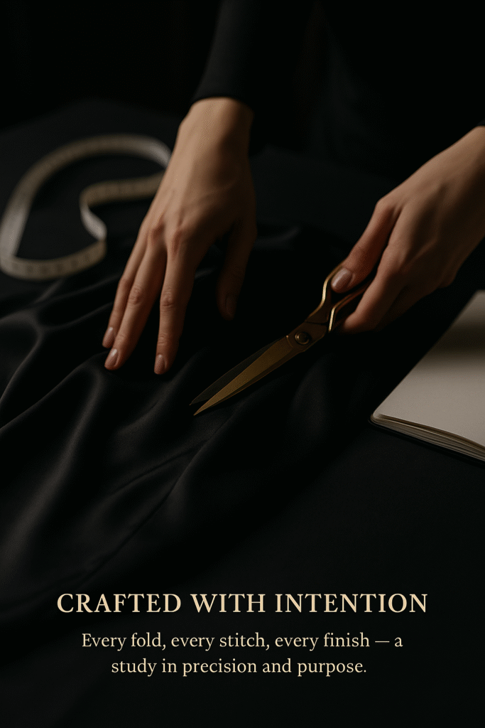 Every piece begins as a study in form and feeling. Our process bridges traditional craftsmanship with modern tailoring, resulting in garments that move fluidly between strength and serenity. Each creation invites the wearer to embrace simplicity as the highest expression of style.