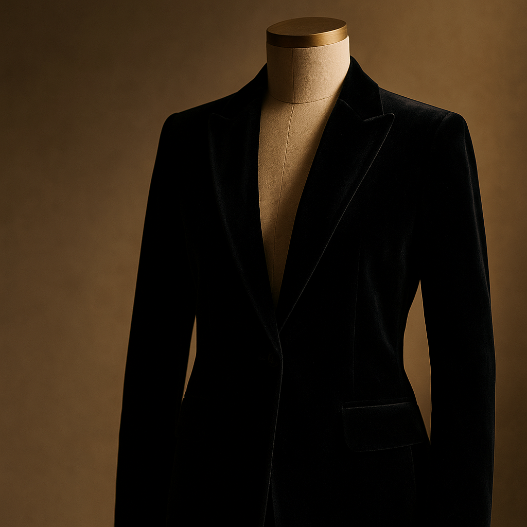 Close-up of a hand-tailored velvet lapel under soft light, showing fine stitching and subtle sheen.